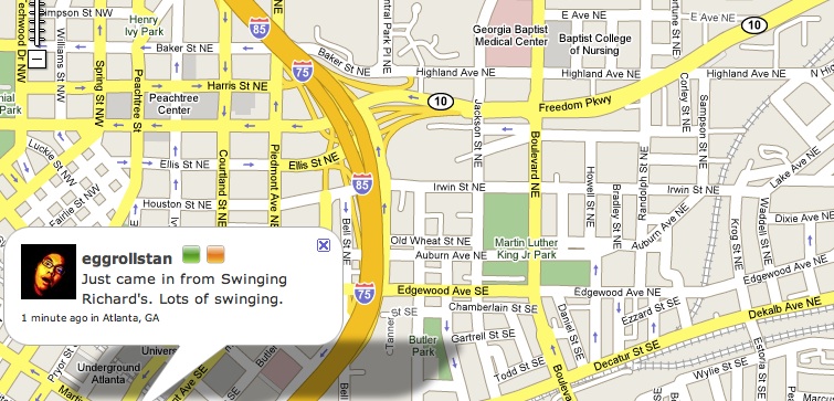 George Orwell was wrong and Alduous Huxley was right. We will gladly give up our privacy, and think it’s fun to do so. I’m not complaining. Maybe I’m complaining. No, I’m not complaining. I’m sure of that. But I’m not sure that I’m recommending that you check out Twittervision. It’s really, really addictive. It’s like the Videodrome signal, or the movie in Infinite Jest (the movie is named Infinite Jest). Or that new heroin with the fun name that the kids are into these days. I just don’t know. Clearly not good for mental health.