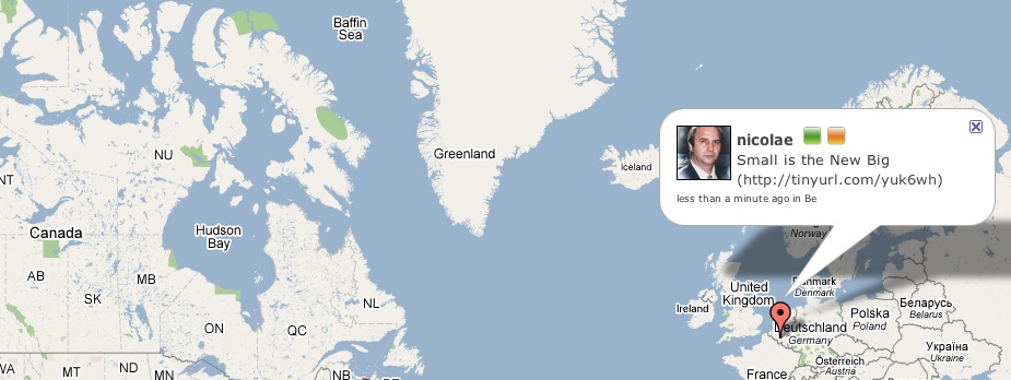 I couldn’t care less about Twitter–or any social networking site for that matter–but I just spent an hour watching Twittervision. I found myself entranced by the plenitude of avatars stochastically zipping across thousands of virtual miles (virtual miles that of course signify real miles); the oblique series of text boxes seemed to reply to each other in a bizarre conversation made wholly of non sequiturs.