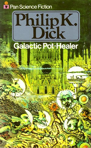 Galactic Pot-Healer is typical PKD, which is to say thoroughly atypical sci-fi with a philosophically paranoid twist (or is that a paranoid philosophical twist?). The story begins as a satire of modern workaday existence, and Dick’s assessment of cubicle life, written in the late 1960s, is almost too-prescient. Fernwright is a typical Dickian hero, a Walter Mitty figure who, real or not, gets to live his dream out (there’s a girl, of course, a sexy alien). After the action moves to Sirius Five, Dick becomes overtly concerned with the major themes of the novel. A precognitive alien race called the Kalends publish a book, a sort of daily newspaper, that accurately predicts the future. The Kalends predict that the raising of the cathedral will fail, and all involved will die. Glimmung, who is repeatedly compared to Faust by everyone in the book (all of these aliens from different planets are not only familiar with Goethe’s version, but other versions as well), attempts to prove that he is master of his own fate. Attracted to this, Fernwright risks his life in the project, and finds a new hope and vitality in meaningful work that he didn’t have back in his cubicle on Terra.