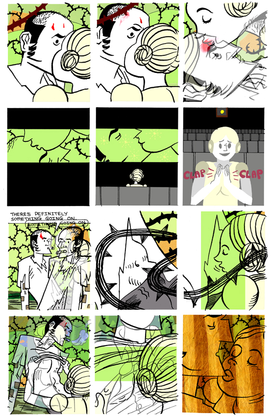 The plant’s telepathic effects allow Shaw to explore what happens within a literalized I-see-you-seeing-me-seeing-you-seeing-me (seeing-y0u-seeing-me . . .) structure. His bright Pop Art goes Cubist in psychedelic trip scenes, superimposing images to show a surreal conflation of not just the melding of two people’s pasts and presents, but those people’s perceptions of past and present. Very heady stuff–but seeing Shaw’s work is superior to my description, of course. Observe, as Panther sees Pearl seeing Panther seeing Pearl idealizing their attempt at romance: