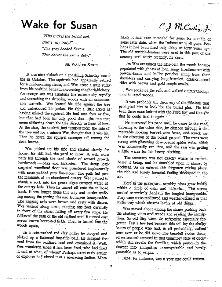 Great find by Reddit user db_usher, who’s unearthed Cormac McCarthy’s early short story, “Wake for Susan” (okay, “unearthed” might be an extreme verb; you can get the story via interlibrary loan from the University of Tennessee, but hey, that takes effort). The piece was published in 1959 in The Phoenix; it’s a bit of juvenilia with its faults, to be sure, but will interest fans of course. Usher’s Reddit post links to a .pdf file; I’ve posted the story after the jump for those who wish to read it on a screen.