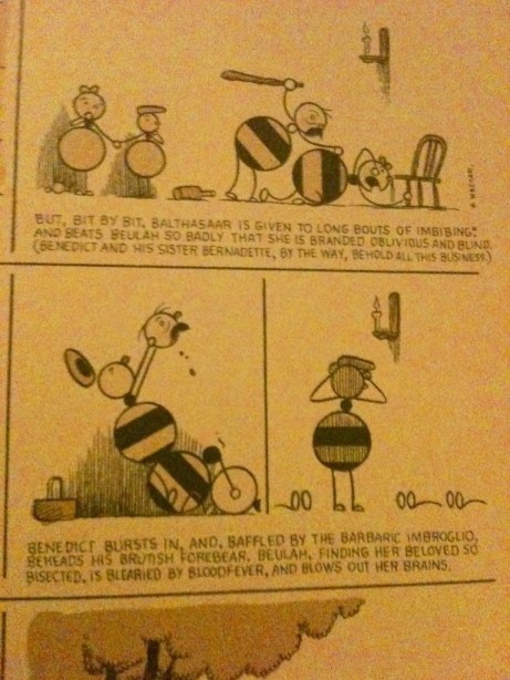 The flashback episode introduces heavy alliteration that continues throughout the rest of the narrative. Framed as a 19th century comic strip, it combines zany humor with horrific familial violence and suicidal despair, an unnerving, bizarre combination that carries over throughout the comic: