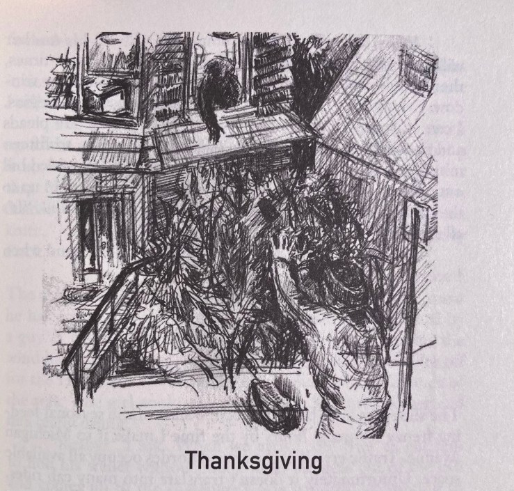 He tells me about going to an event with Chicago Bulls players, proudly showing the autographs he collected. He is excited like a kid would be, which makes me think the broken-down car might actually exist. He asks if I’d had my Thanksgiving meal.