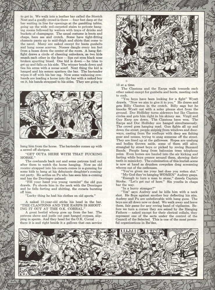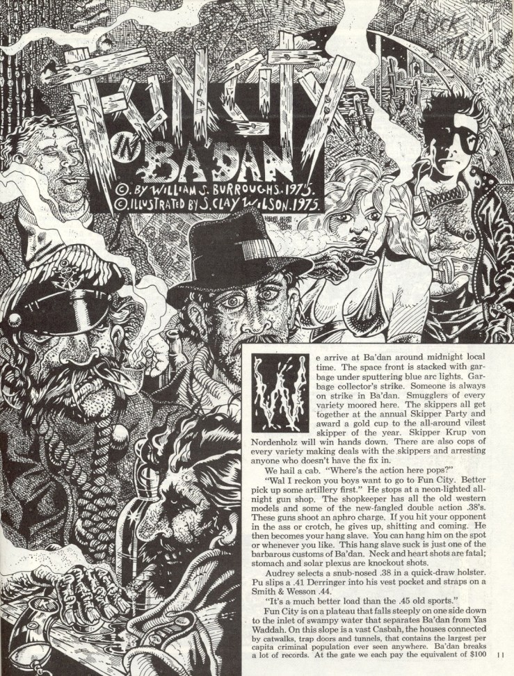 “Fun City in Ba’dan” was published in Arcade, vol. 1, no. 4 in the winter of 1975. The story is an excerpt from William S. Burroughs’ then-novel-in-progress, Cities of the Red Night and is illustrated by underground comix legend S. Clay Wilson. The front matter includes a portrait of Burroughs that doesn’t show up in the story.