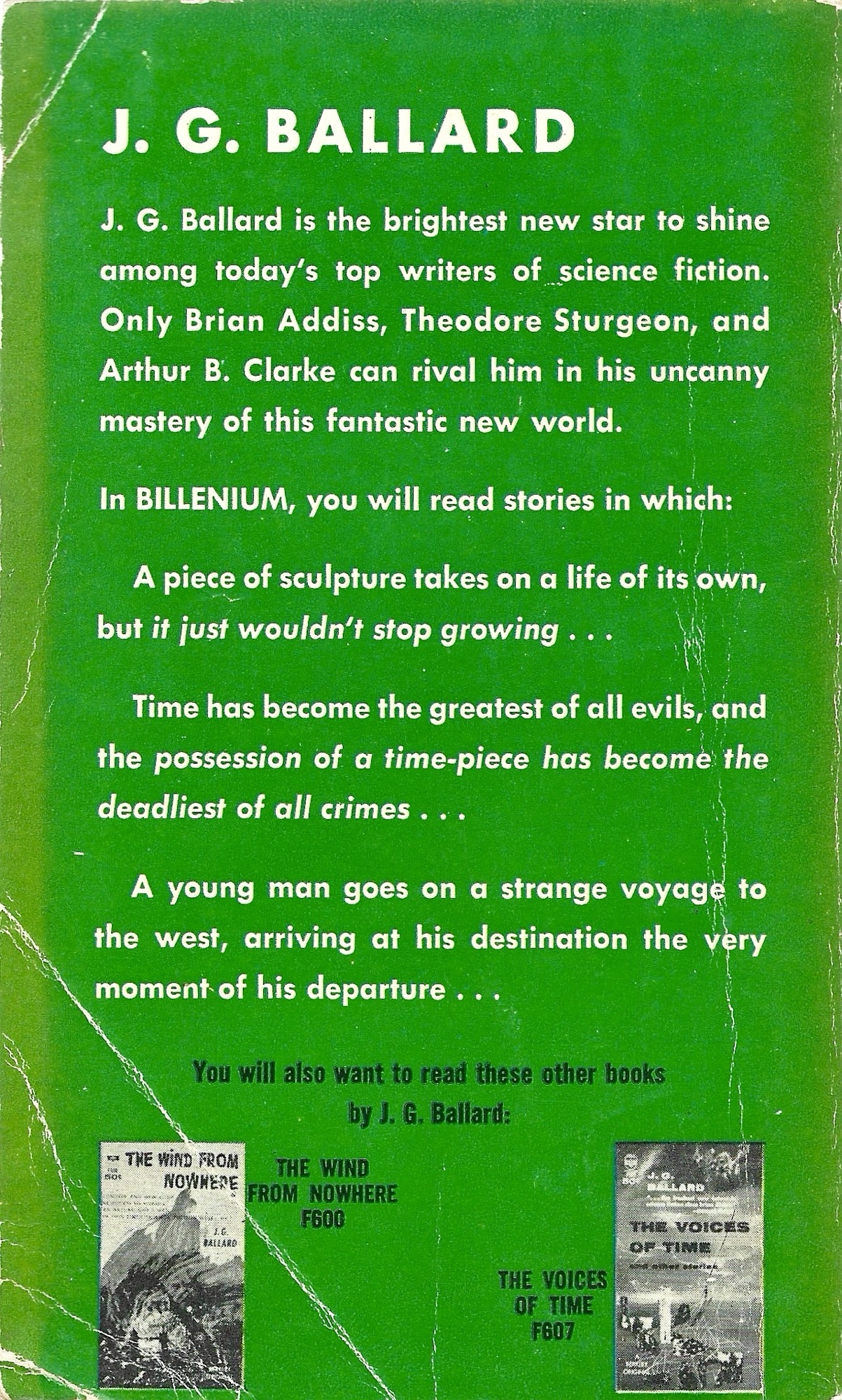Ten years ago I read The Complete Short Stories of J.G. Ballard and wrote about them on this blog. At the end of the (exhausting) project (about 1200 pages and just under 100 stories), I made a shortlist of 23 “essential” J.G. Ballard short stories. I included two of the ten stories from Billenium in that list: the title track “Billenium” and “Chronopolis.” Of the latter, I wrote: