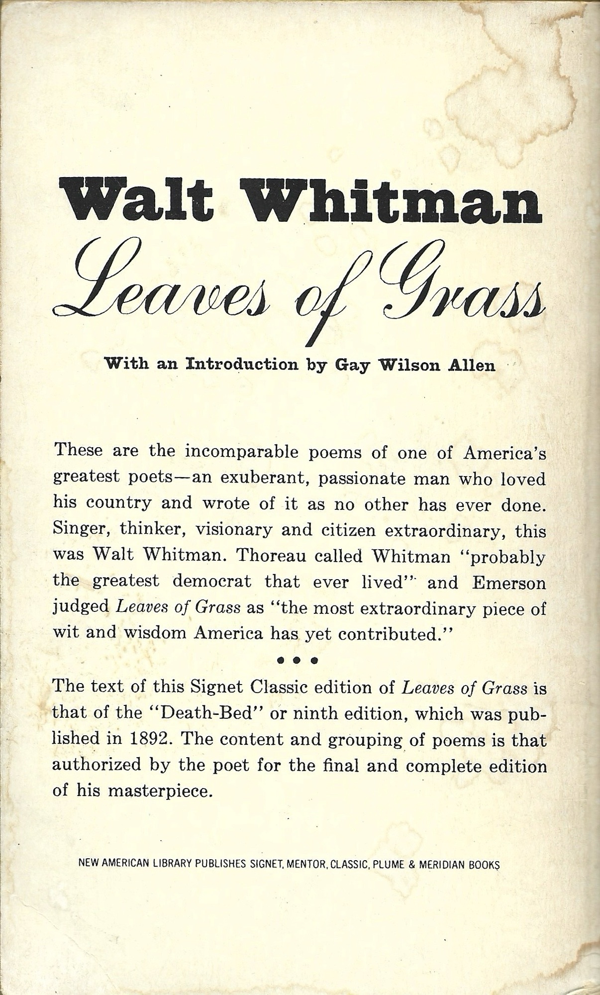 Leaves of Grass, Walt Whitman, 1892 (9th ed.), Signet Classics (no print date; 1958 copyright on Gay Wilson Allen’s introduction). No cover artist or designer credited. 430 pages.