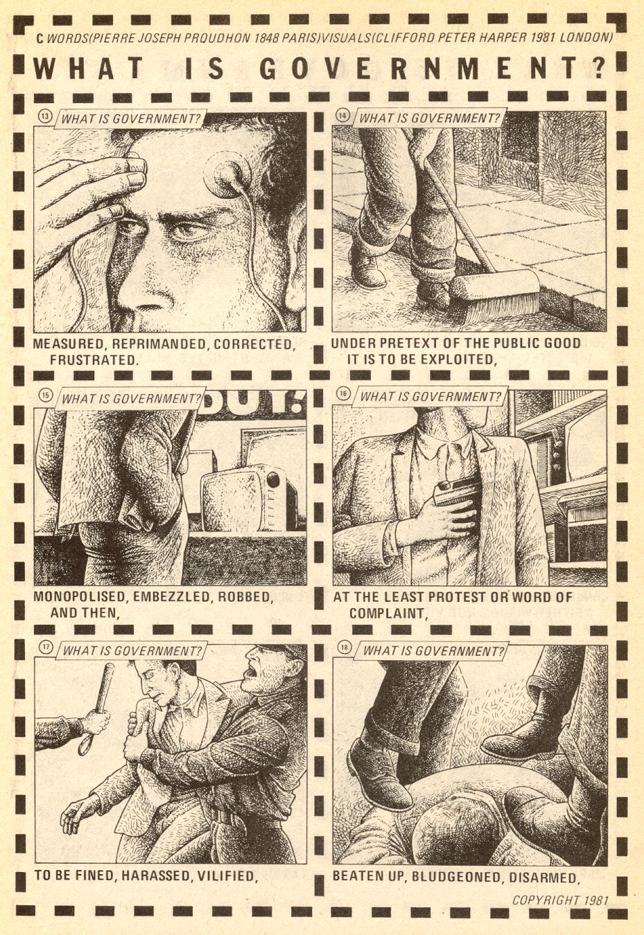 From “What Is Government?” by Clifford Peter Harper, a visual adaptation of text by Pierre Joseph Proudhon. Published in Anarchy Comics #3, July 1981, Last Gasp Comics.