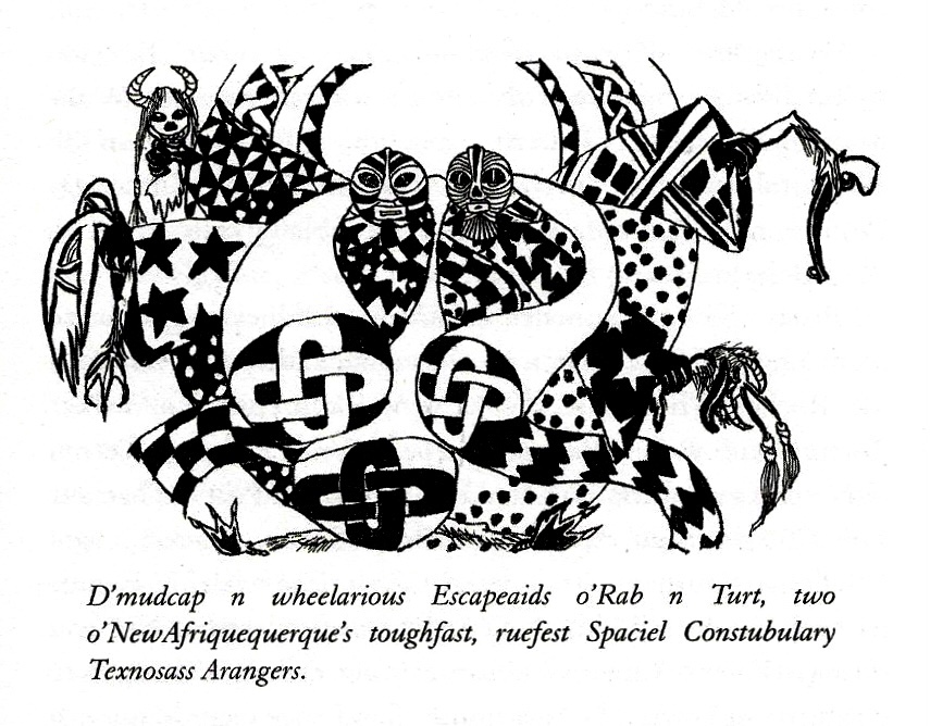 So Chig, who has told us he looks always to choose the “correct words,” comes through languish/language “back tRealty,” to commence again his education and reconstruction. He’s given new names Mr. Chuggle and Mr. Chigyle. Renaming becomes a motif in the novel. Here in the dreamworld—or is it reality, as Chig’s dreamteachers seem to suggest?—there are multiple Chigs, a plot point emphasized in the novel’s strange title. Dunfords Travels Everwheres seems initially ungrammatical—shouldn’t the title be something like Dunford Travels Everywhere or Dunford’s Travels Everywhere? one wonders at first. Packed into the title though is a key to the novel’s meaning: There are multiple Dunfords, multiple travels, and, perhaps most significantly, multiple everywheres. The novel’s title also points to two of its reference points, Swift’s satire Gulliver’s Travels and James Joyce’s Finnegans Wake (famously absent an apostrophe).