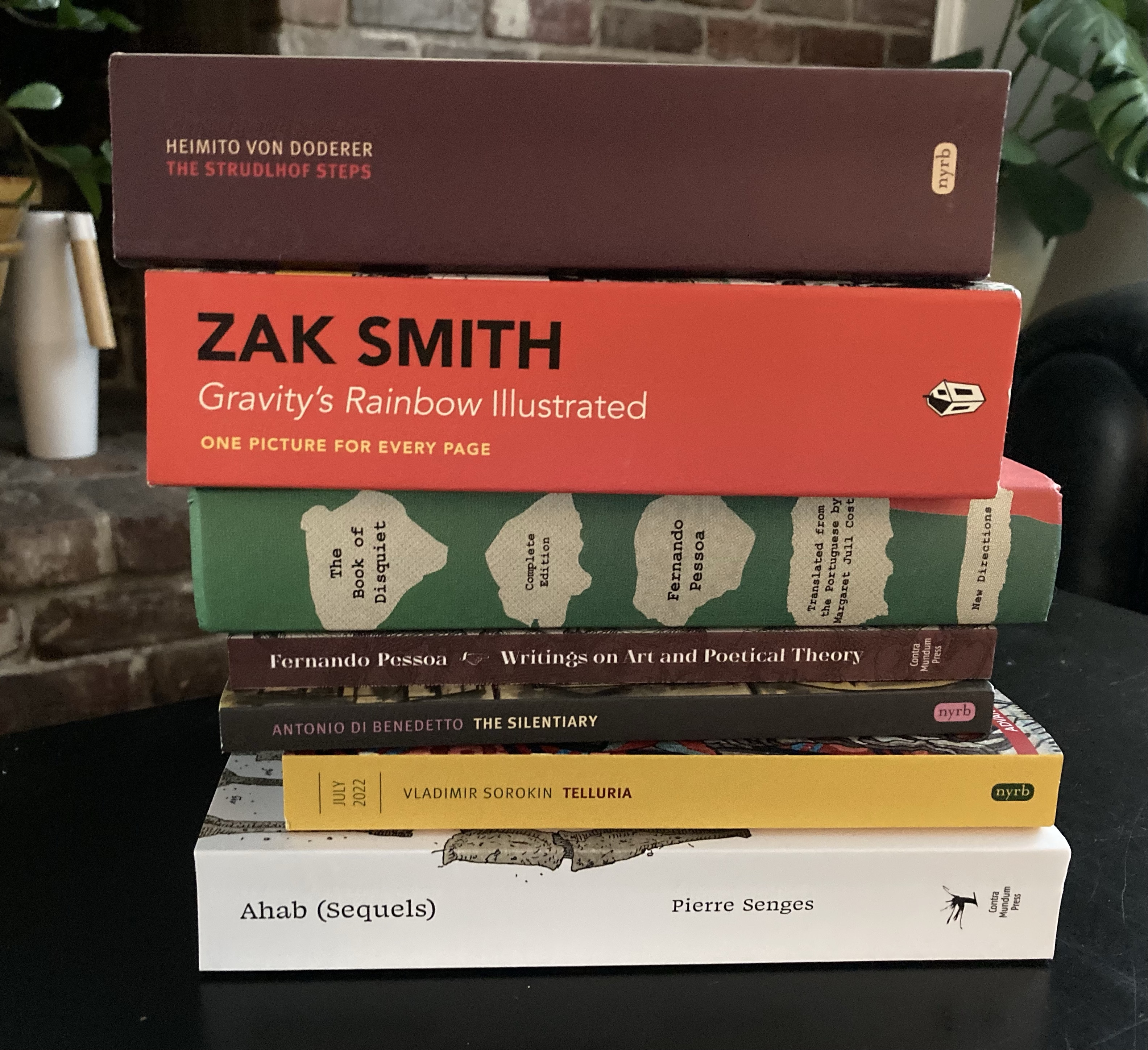 The two by Pessoa cause me anxiety for other reasons. I’m pretty sure I will never finish The Book of Disquiet (in translation by Margaret Jull Costa). It’s smart at times, but it’s not really a novel—the catch is the protagonist’s consciousness. And the protagonist often needs a big kick in the ass. Disquiet will riff out some lovely little missives, and then whine a bit. Not my favorite flavor. And yet I feel like I can’t tangle with Writings on Art and Poetical Theory without engaging Pessoa’s aesthetic firsthand (or, really, mediated through translators and editors).