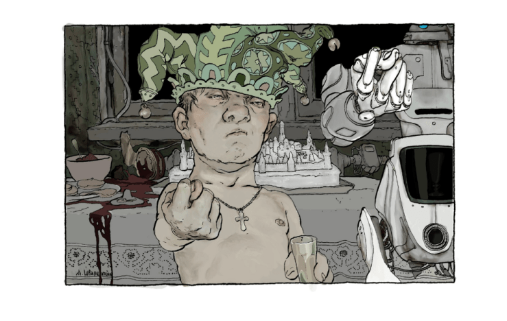 The spouses never betrayed their gastronomic preferences, as they always ordered an 1889 Tokay, a swamp grass salad, the roots of elderly proletarians’ wisdom teeth, marengo made from bolonkas, parchment with toad caviar, and the menisci of third league Belarussian football players under a pile of vomit. For dessert, Svetlana would have rock crystal with whipped bull saliva or “Lair.” Having eaten their fill, they would move on to the jointer-inlaid tabernacle, wipe the prisms and trample the hamsters for forty minutes, then slide down the larded chute into the cloakroom.