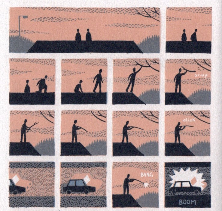 A few weekends ago, I spent several days primitive camping on a tiny, rocky island off Cape Canaveral. The weather was miserable and the fishing was poor, but the company and bourbon offered cheer. Still, by the time I got home I was terribly sore, thoroughly damp, and inhabited by one of those hangovers that sets up shop inside one’s soul as a kind of second-consciousness, coloring the world a dreadful surreal blue. I wanted to see my family, but they were out playing tennis. There was a small stack of packages waiting for me though—review copies for this blog—with Jon McNaught’s Birchfield Close neatly nestled atop. After showering, I lay on my soft soft bed in the afternoon, read through the brief poem-novel-comic, and drifted into a gentle warm hazy nap. It was the most marvelous medicine. Sublime.