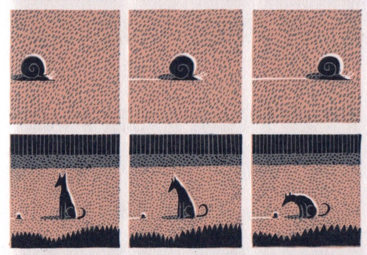 They see birds and people, dogs and snails, balloons and bikes (etc.), all rendered in gentle gradations of orange-pink and grey-blue and black-black.