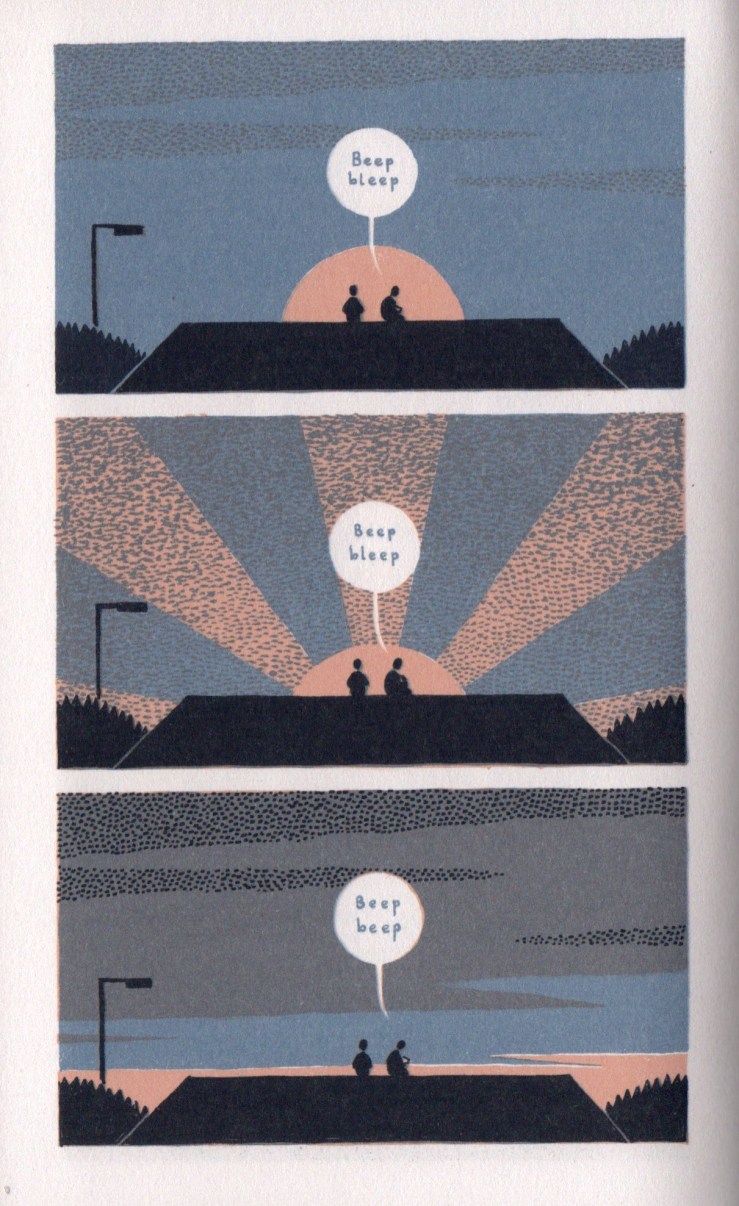 I’ve read Birchfield Close a dozen times now (read? Is that the right verb?), and I’m still (happily) unsure what commentary McNaught might be making on media. The story is full of images of “entertainments” that may or may not be at odds with the neighborhood’s ambiance: a handheld video game, a banal soap opera, a pop song on the radio. In another favorite episode, we move from rooftop to an airplane flying through the sky to the actual inside of the airplane, where a passenger watches Nemo’s reunion with his overprotective father. On the next page, we are treated to the imaginative forms that the clouds might take—formations that the airplane passenger, wrapped up in viewing Finding Nemo on a tiny headrest screen, perhaps misses. But if there’s a judgment here, McNaught seems to leave it to the viewer to suss out. As we pan back down to the boys on the roof, we see that one remains watching the clouds, shaping them in his imagination (or perhaps he’s sharing an imaginative vision with the airplane passenger), while the other boy has returned to his own tiny screen to play a fighting game. He misses the sunset.