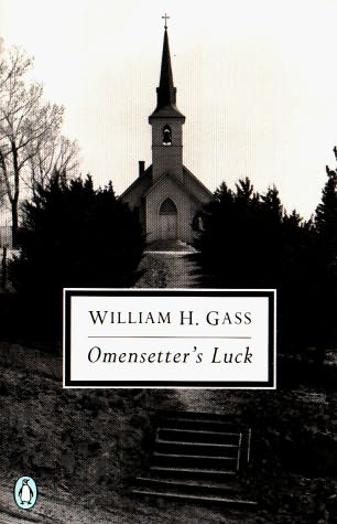 I’ve also been reading William H. Gass’s first novel, Omensetter’s Luck. It’s weird, wonderful, Faulknerish in its loose (but somehow layered and constructed) stream of consciousness. Omensetter’s Luck comprises three sections, each progressively longer; I finished the second one today, and so far the novel seems to dance around a description or accounting of its namesake, Brackett Omensetter who carts his family into the small sleepy town of Gilean, Ohio, and immediately perplexes the townsfolk with his amazing luck. As Frederic Morton put it in his contemporary