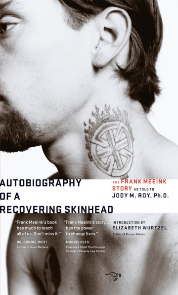 And, speaking of Wallace (again), or at least using him as a crutch–I’ve almost finished Autobiography of a Recovering Skinhead by Frank Meeink (“as told to” Jody M. Roy; they’ve sort of got the whole Malcolm X/Alex Haley thing going on there). So, yeah, why the Wallace segue? How to justify it? Well, reading Meeink’s story, the true story of an abused, battered Philadelphia kid who falls into the American neo-Nazi movement and its attendant violent crime and terrorism, who goes to prison and finds redemption and human connection and a new purpose for the nihilistic void of his life, who falls into alcoholism and drug addiction only to be redeemed again–reading Meeink’s story, even knowing its veracity (demonstrable to a point that would satisfy even Langer’s Ian Minot)–I couldn’t help but read his strong, immediate, gritty, and utterly real voice as something not unlike one of the creations in David Foster Wallace’s Brief Interviews with Hideous Men. It’s not just Meeink’s hideousness, his violence, or the grace that he works toward–all constituents of DFW’s collection–it’s that voice, the realness of the volume, surely the book’s greatest asset. Recovering Skinhead is an engrossing read, fascinating in the same way that an infected wound prompts our attention, our paradoxical compulsion and repulsion, but most of all it’s an exhilarating and exhausting performance of voice, of Meeink’s unrelenting, authentic telling of a tale, a telling that any novelist would thrill to channel. Only Meeink’s voice isn’t a novel creation: it’s real. Autobiography of a Recovering Skinhead is available now from