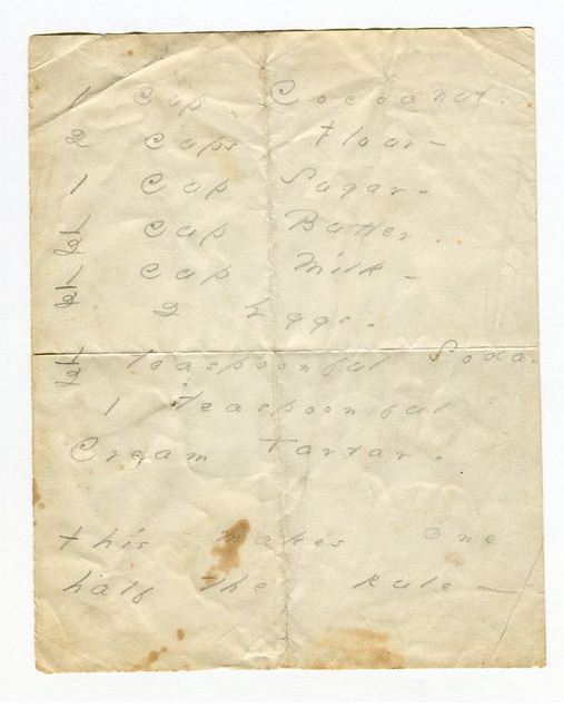 Emily Dickinson’s  recipe for cocoanut cake, via Tori Avey at the The History Kitchen. Avey’s post is great—she guides the reader through making the cake, includes photos of the process, and even pairs the recipe with an appropriate poem. And of course, she transcribes Dickinson’s scratchy notes: