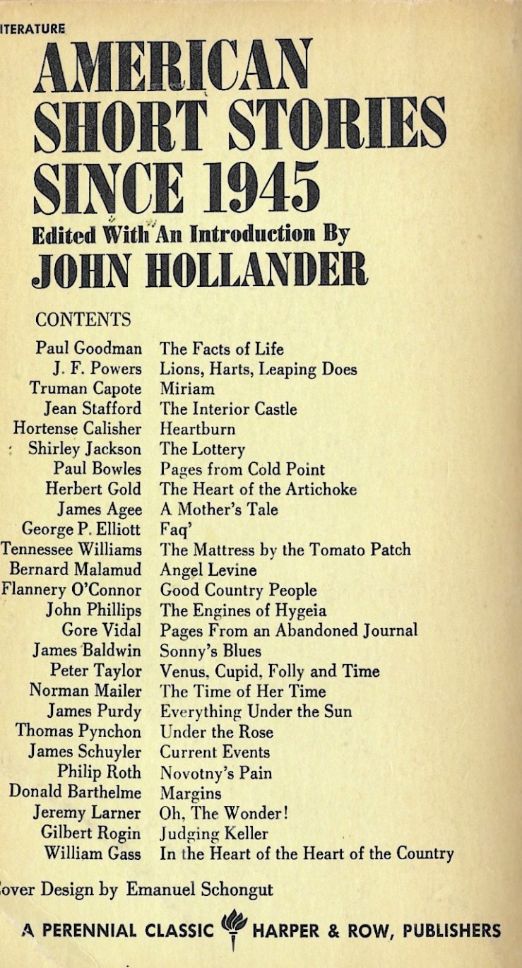 Edited and introduced by the poet John Hollander, Since 1945 “aims to show the major shapes taken by shorter fiction in America since the end of World War II.” Published in 1968, it’s heavy on the white guys, but I think there’s an attempt here to point toward not just “major shapes,” but new shapes.