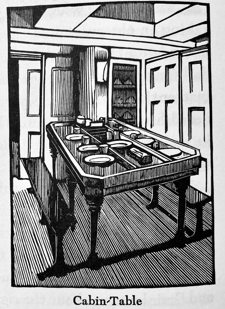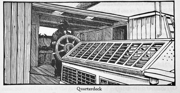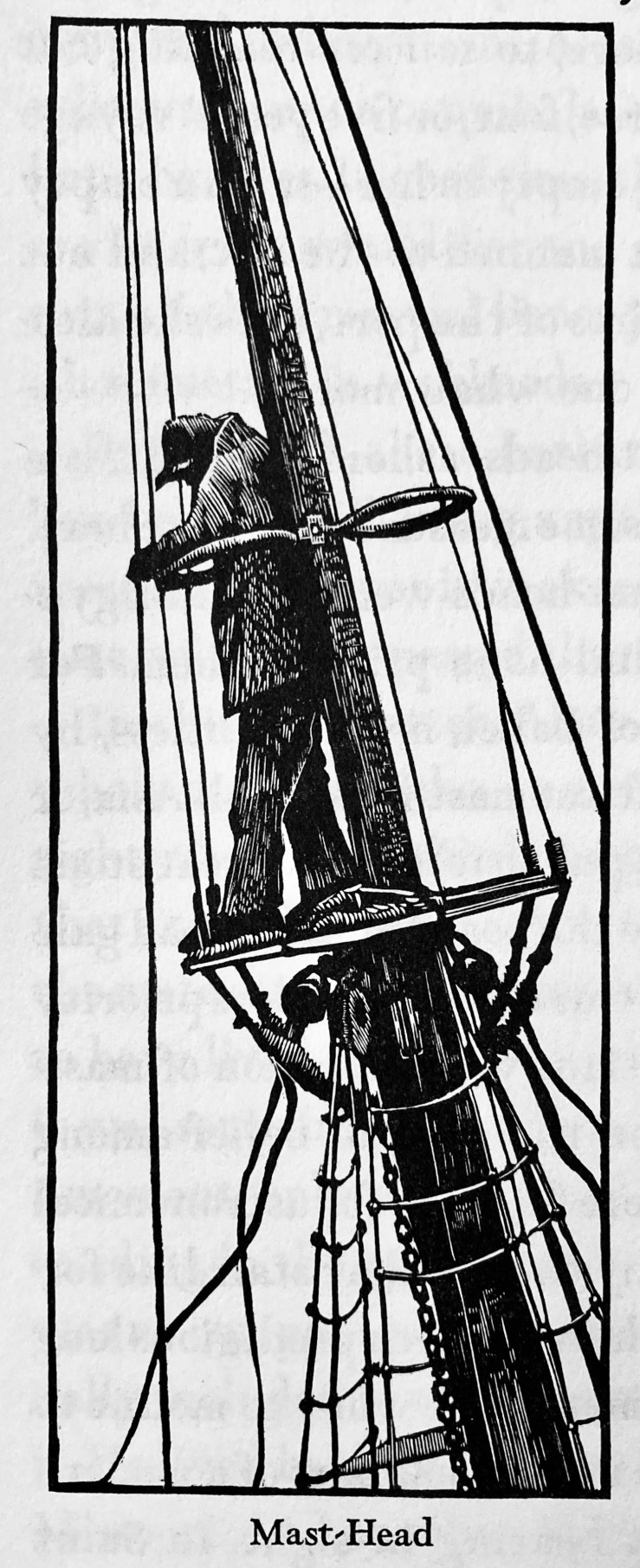 Another chapter where our “quiet ghost” narrator Ishmael is able to inhabit the private thoughts of others—here, glimmers and glimpses of Ahab’s mind, but also full access to Starbuck’s consciousness: “Terrible old man! thought Starbuck with a shudder, sleeping in this gale, still thou steadfastly eyest thy purpose.”