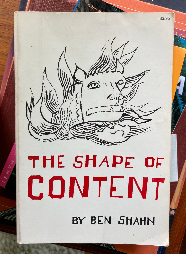 text Structure of Awareness. I was unsuccessful there, but I did spy something called The Shape of Content by the artist Ben Shahn. I’ve long been a fan of his work, so I picked it up and thumbed through. I ended up reading most of it this weekend.