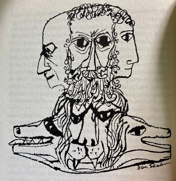 The Shape of Content (the title now is not exactly ironic, I guess) collects a series of lectures Shahn gave to Harvard students in the late 1950s. The first lecture is a somewhat boring apologia, a kind of What the hell am I doing here?, but the following material is good stuff, if not exactly fresh. There are plenty of illustrations too, mostly unrelated to the, uh, content of the words (although they are of course intimately related). Illustrations like the one above, and this one, below, make the 144 pager seem, well, kinda short.