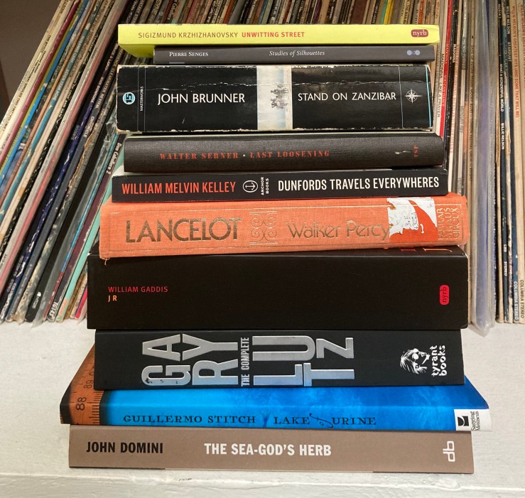 The Gordon Lish books were almost certainly smashed up against the B.S. Johnson and Evan Dara books — I think I wasn’t sure where to shelf them. I have been very mad at Gordon Lish for a few years now for reasons I promised not to divulge but which basically have to do with his being a flaming asshole. I finished Markus Werner’s novel The Frog in the Throat a week ago and the ending made me tear up. It’s a novel about aging and failure and fear; it’s very, very funny. The late great David Berman once said that Robert Stone’s Dog Soldiers was his favorite novel. I loved it and I suppose I’ll refuse to read another Robert Stone novel. (Why?)