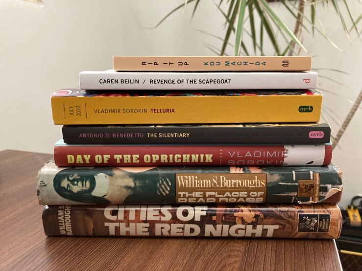Max was kind enough to undertake a second interview with me; the occasion this time the red/blue NYRB publications of Blue Lard and his translation of a collection of Sorokin’s stories published under the name Red Pyramid. During that interview process, I was lucky enough again to sample some of Max’s forthcoming Sorokin translations (The Norm is particularly far out, while The Sugar Kremlin will appeal to anyone who dug Telluria). That interview needs a few edits, but it’ll run in a day or so. In it, Max suggests that when approaching Blue Lard, we should “surf its wave and not expect full comprehension.”
