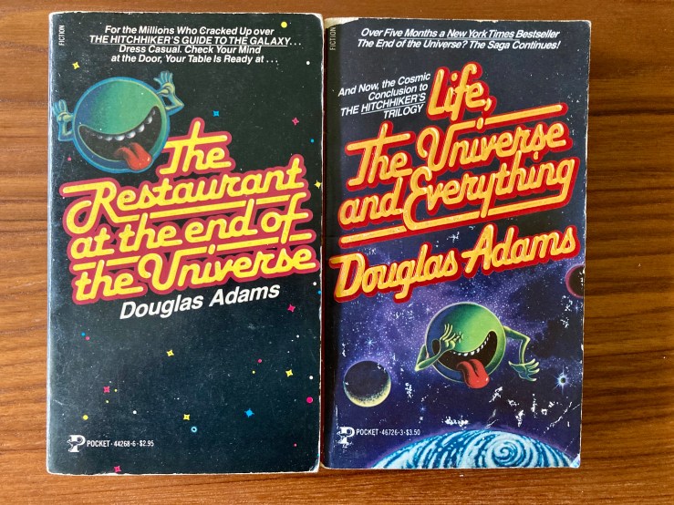 So my son finished Douglas Adams’ A Hitchhiker’s Guide to the Galaxy on Tuesday night, giving me a nice excuse to swing by the used bookstore on Wednesday to pick up the next two entries in the series, The Restaurant at the End of The Universe and Life, the Universe and Everything. I managed to find the same editions I read when I was his age. I gave my copies to one of my students some time in the early 2000s, back when I was teaching high school.