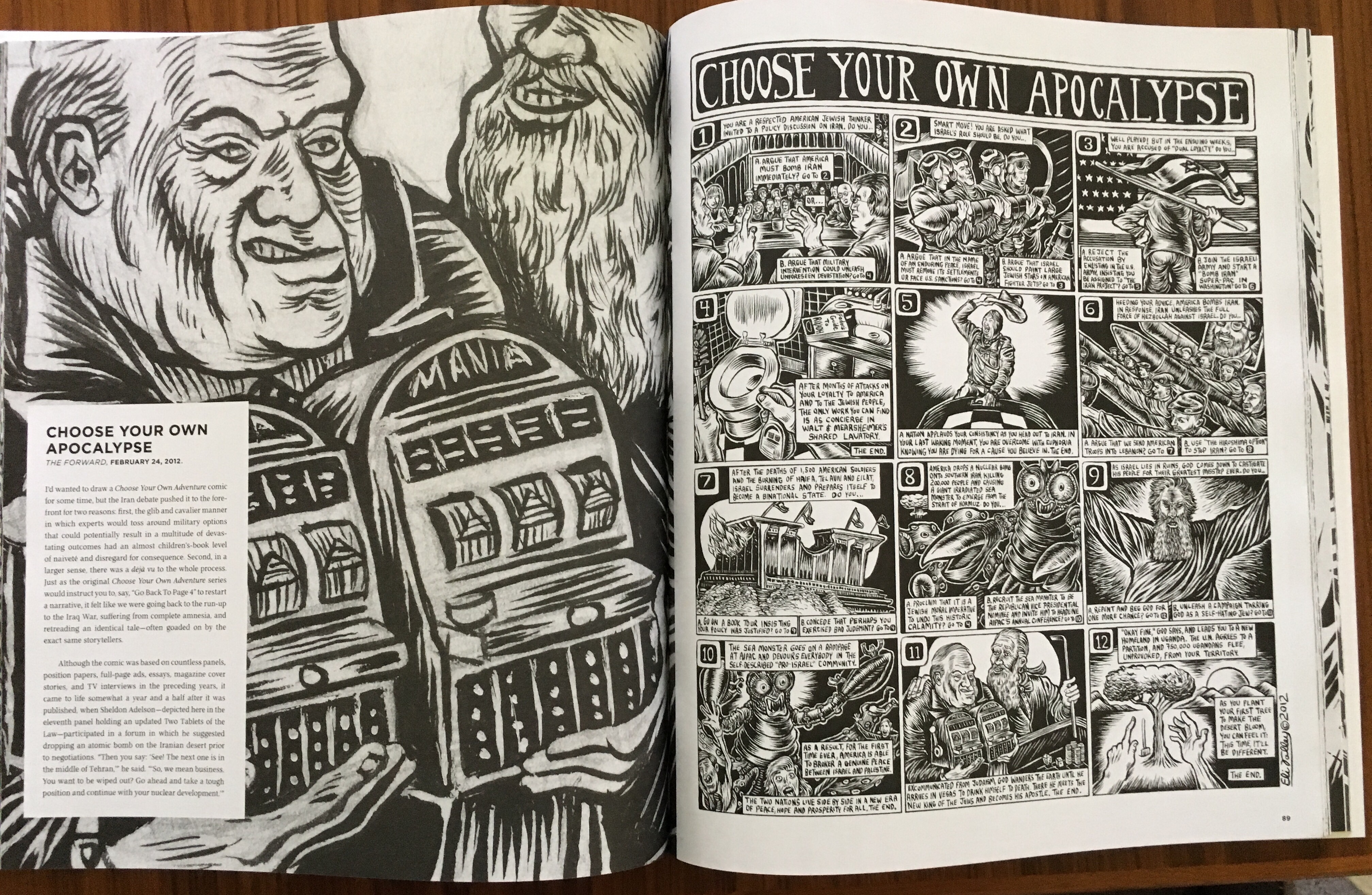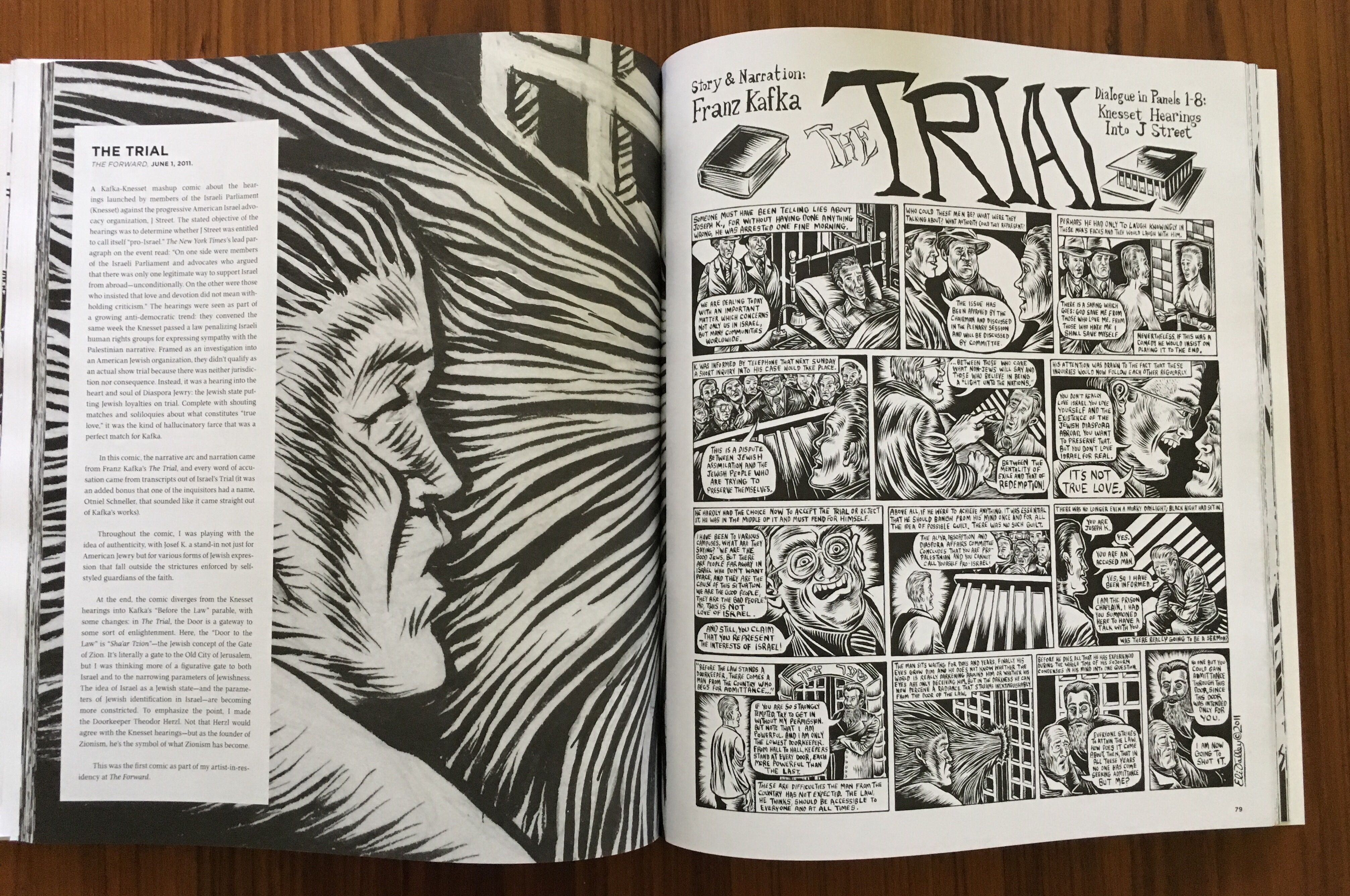 The anthology makes great use of its oversized format. On the left-hand pages, Valley introduces each comic (all chronologically-ordered, by the way) with a short essay that offers context, personal reflections, and even analysis or interpretation. The comics are then reproduced on the right-hand pages. You can see this below, in Valley’s mash-up of Kafka’s The Trial with the Knesset vs. J Street hearings: