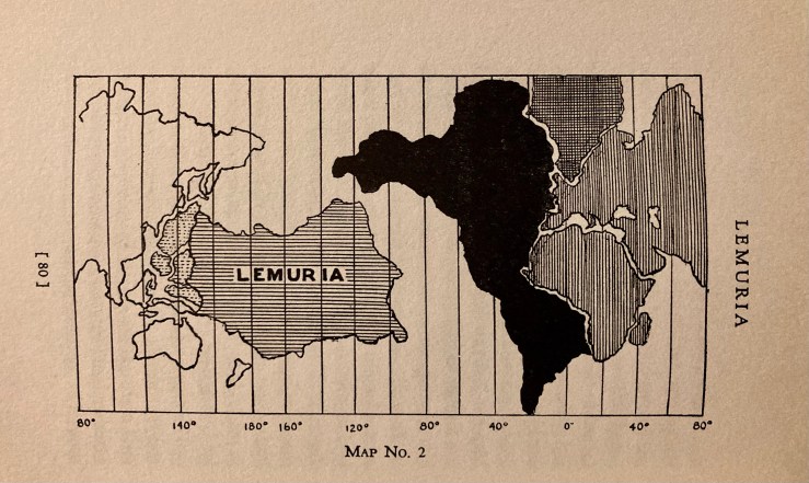 I did come across a book published by something called Rosicrucian Press in the 1930s–W.S. Cerve’s Lemuria: The Lost Continent of the Pacific. Lost Lemuria hangs over a few Pynchon novels (and is touched on in Charles Portis masterful and zany Masters of Atlantis)—so of course I picked up Cerve’s book. Chapters include “The First Races of Man in America,” “Mysterious Forces in the Universe,” and “Present Day Mystic Lemurians in California.” There are also diagrams, charts, and maps, like this one: