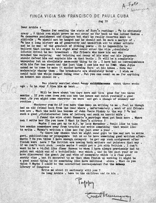Ernest Hemingway Writes Archibald MacLeish About Ezra Pound’s Craziness