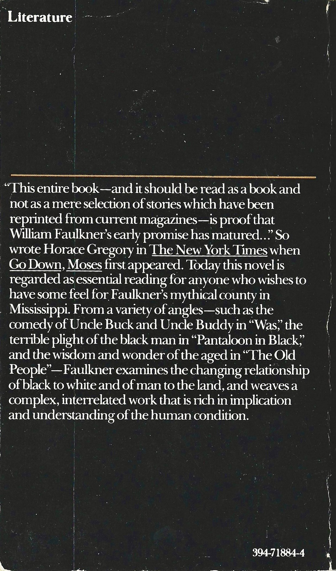 Go Down, Moses, William Faulkner. Vintage Books Edition (1971). Cover photo by Robert Wenkham. 383 pages.