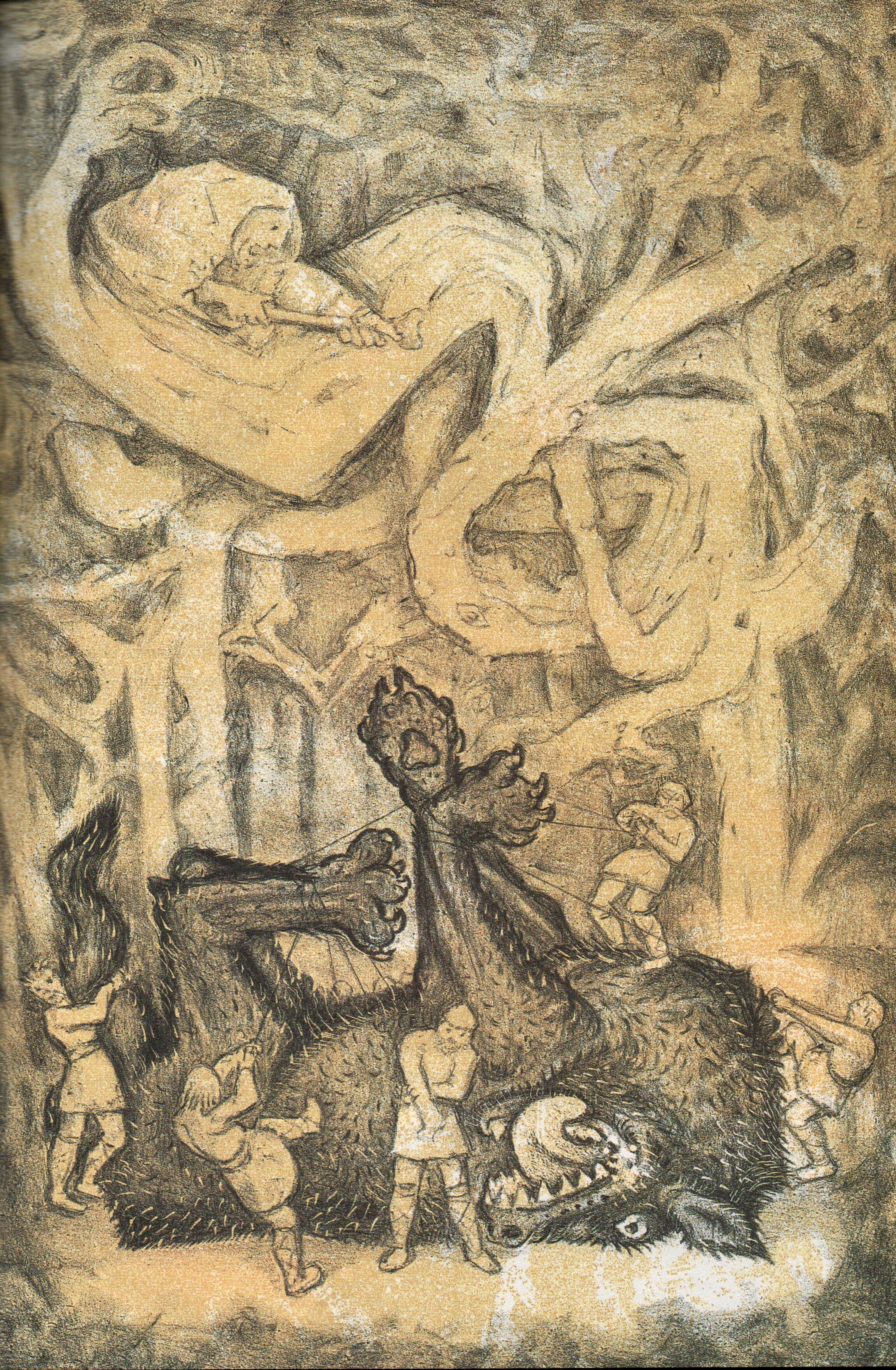 From Ingri and Edgar Parin d’Aulaire’s Book of Norse Myths. Published by NYRB. My son and I have enjoyed the hell out of it.