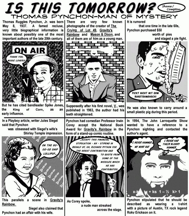 “Thomas Pynchon: Man of Mystery” — Comic by Kelly Shane & Woody Compton, part of their Is This Tomorrow? series.
