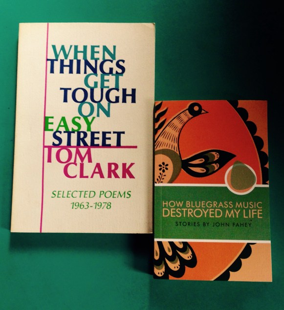 I spent the past couple of days in NYC, visiting friends and museums &c., and while to my shame I didn’t make it to the famous Strand (I blame my young children’s limited patience), I did visit Spoonbill & Sugartown Booksellers in Brooklyn, where I picked up this handsome Tom Clark collection for the friend who took me there, along with John Fahey’s collection How Bluegrass Music Destroyed My Life (which the same friend had loaned me 15 or so years ago, and I had actually returned). I also bought some kids books which I didn’t photograph because my kids absorbed them already.