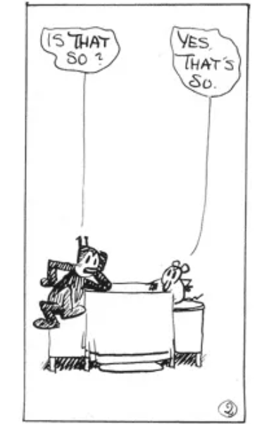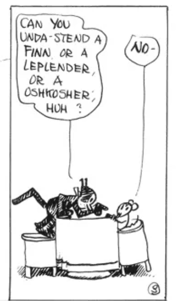 Lerman’s satire of these “ollie garx” and their relations with Roy is riddled with great gags. The oligarchs give Roy bald eagle eggs, which he proceeds to fry up to Dav’s dismay. They take him golfing and try to get him into Ayn Rand. They explain their anti-nature views—Mother Earth isn’t a caring mother but a devouring father who must, in oh-so Freudian terms, be eliminated. (Lerman, who always sneaks literary allusions into his strips, can’t resist referencing Faulkner’s As I Lay Dying during this exchange.) In one of my favorite exchanges in Escape, the oligarchs try to explain to Roy why his main talking point to convince the Snake Creek denizens to drill should be the promise of jobs: