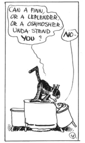Only a few strips later, we find Dav’s illusions deflated. “S’all trash!” he declares over the mess of his nascent manuscript. Roy tries to help Dav. Snake Creek folk are all riled up over the plans of some “ollie garx” and the people are protesting. Roy rightfully recognizes potential inspiration here. He can bring his pal back to earth. “Sum sorter politicka thing” is happening, and that might be the inspirational grist Dav needs, right? But Dav rejects him: “I do not wish to know about anything that happened on this earth.” It might be hard to change the course of earthly life with that attitude. Instead of heeding Roy’s advice, Dav falls deeper into navel-gazing, imagining his future success, and generally doing anything except writing.