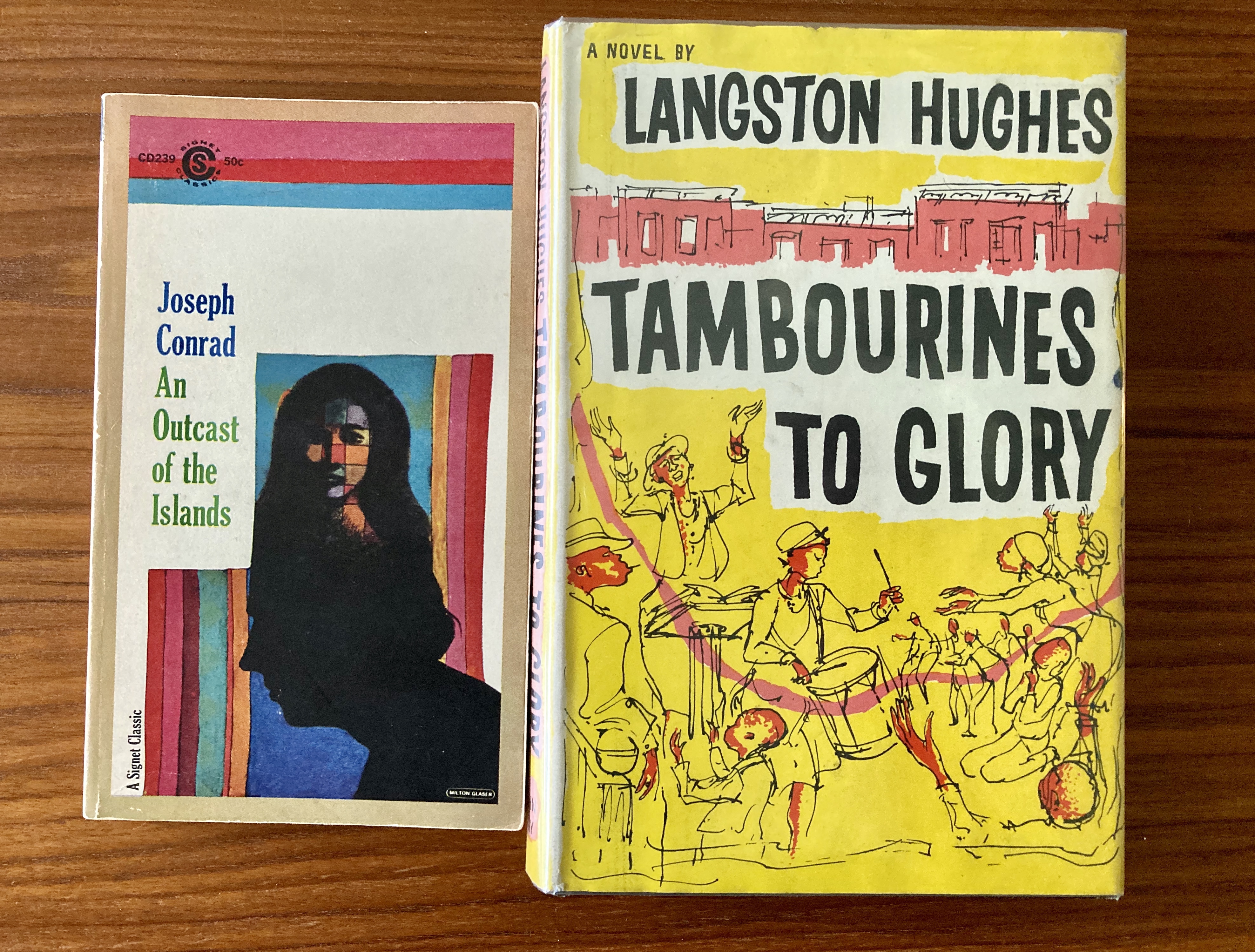 Then I came across a hardback first edition of Langston Hughes’ second novel Tambourines to Glory. At thirty bucks, it ate up the rest of my store credit, but it’s in excellent condition with no damage to the jacket and foxing only on the front flyleaf. It’s an old library book, but was fortunately spared any ugly WITHDRAWN stamps and appears never to have had a pocket in the back. Indeed, I’m not sure if the book was ever even read by anyone. Besides a few stamps identifying the library it once belonged to, the only mark in the book is on the front flyleaf: