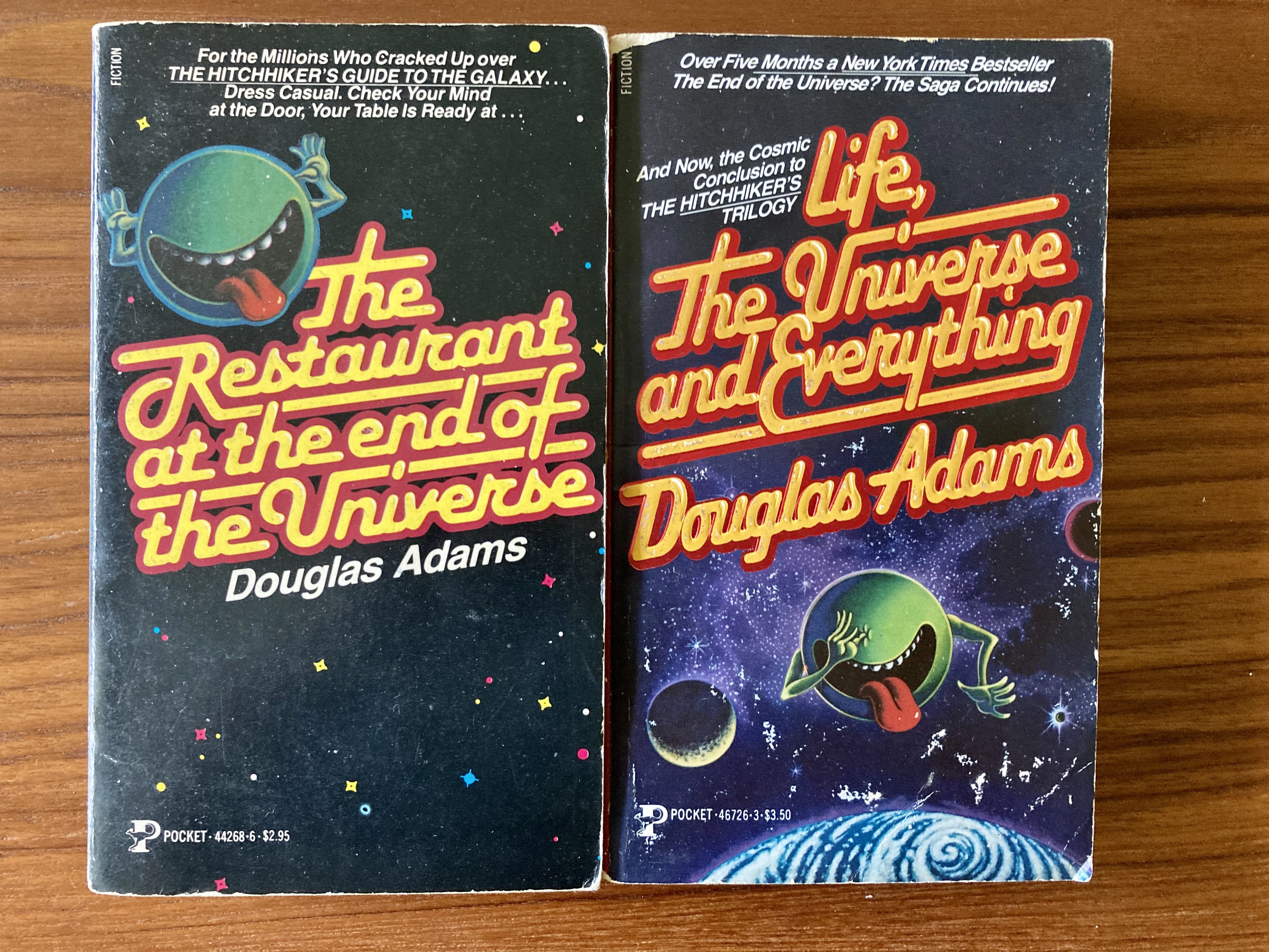 So my son finished Douglas Adams’ A Hitchhiker’s Guide to the Galaxy on Tuesday night, giving me a nice excuse to swing by the used bookstore on Wednesday to pick up the next two entries in the series, The Restaurant at the End of The Universe and Life, the Universe and Everything. I managed to find the same editions I read when I was his age. I gave my copies to one of my students some time in the early 2000s, back when I was teaching high school.
