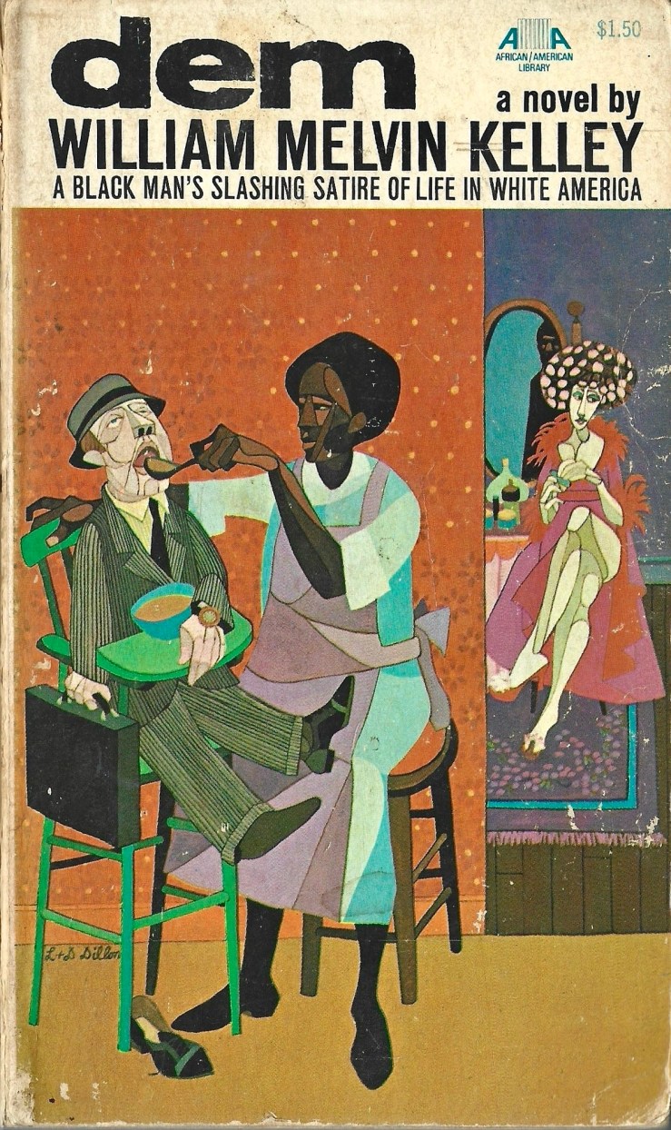 I managed to snag a cheap used copy of William Melvin Kelley’s fourth novel Dem (or, more properly, dem) yesterday. I usually just snap a pic when I do these book acquired posts, but the cover for this 1969 Collier mass-market, by Leo and Diane Dillon, was simply too good not to scan.