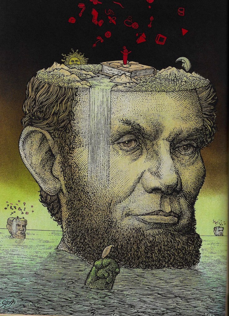 A portrait of Abraham Lincoln, from Adventure Time: The Enchiridion & Marcy’s Super Secret Scrapbook, 2015, by Mahendra Singh (b. 1961)