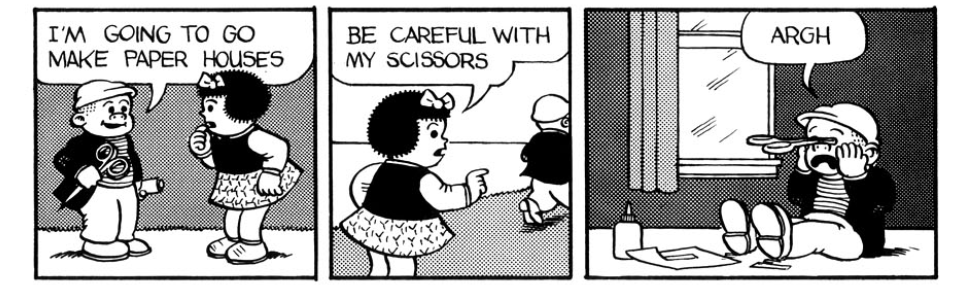 And I can wait in hope, I suppose, or at least in absurd appreciation like Sluggo in Ernie Bushmiller’s Nancy strip of 23 Oct. 1954, who finds surreal intercession in the form of a potted plant descending from the heavens to land upon his bald crown. I too wish I could crack this walnut.
