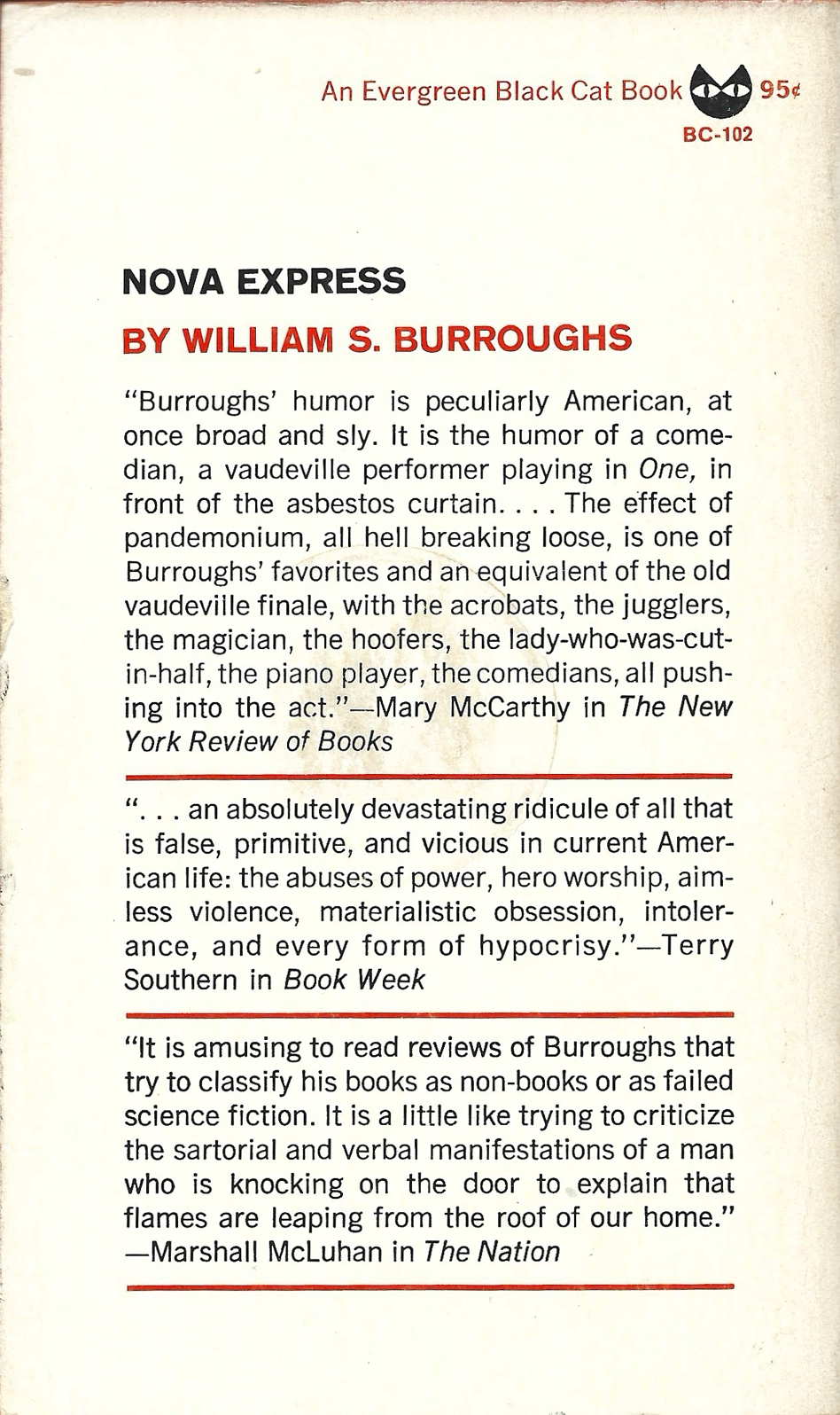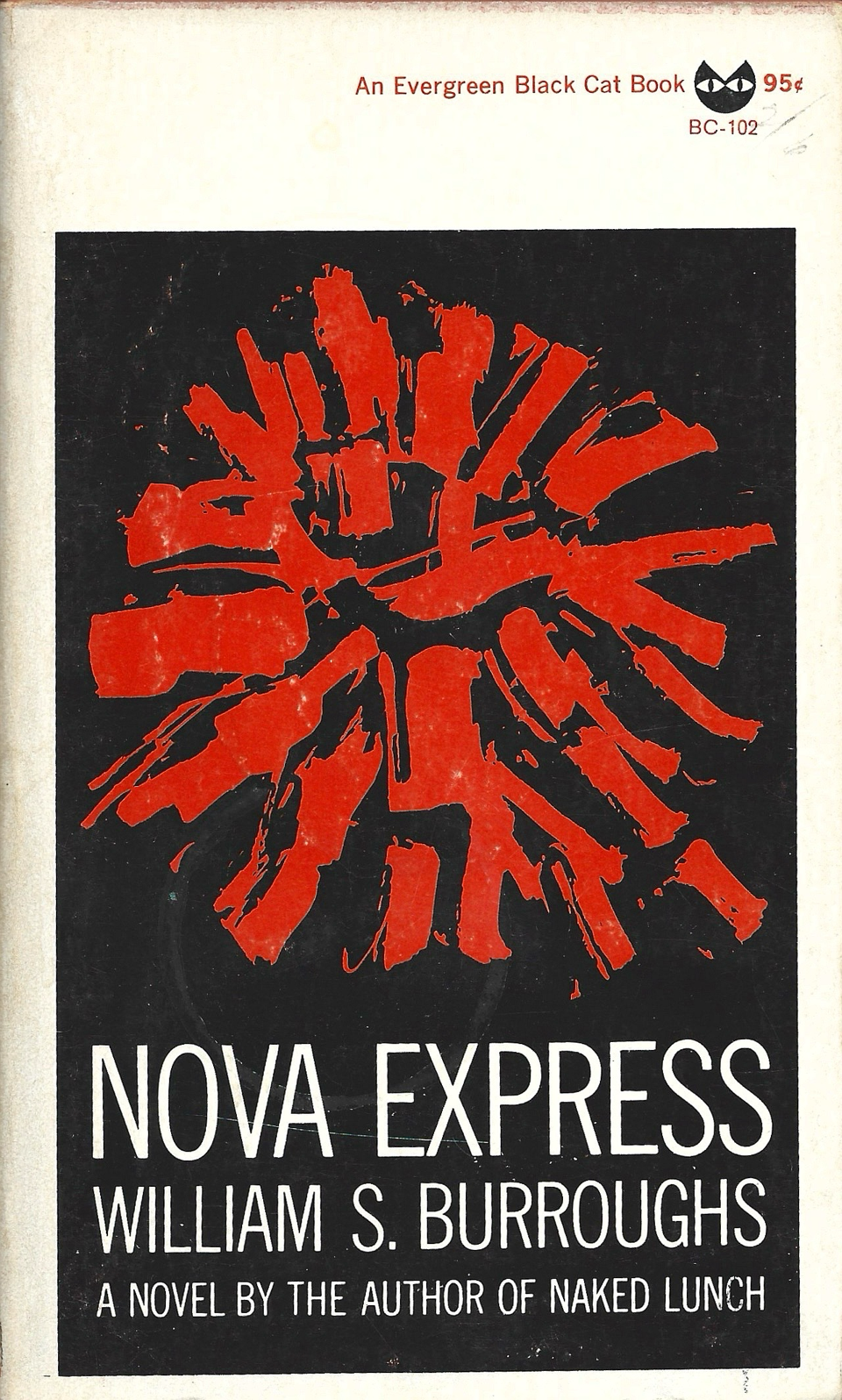 Nova Express, William S. Burroughs, 1964. Evergreen Black Cat Books (1965). 155 pages. The cover by artist Grove Press mainstay Roy Kuhlman is not credited.