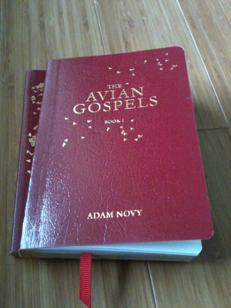 Biblioklept: I have a lot I want to ask you about what’s in your novel, but I have to start by asking about the physical book itself. The Avian Gospels is a lovely little two volume pocket-sized monograph—textured oxblood covers, gilded pages with line numbers, inset bookmarks. Visually, it recalls a Gideon bible, I guess, only not, I don’t know, chintzy. Where did the design idea come from?