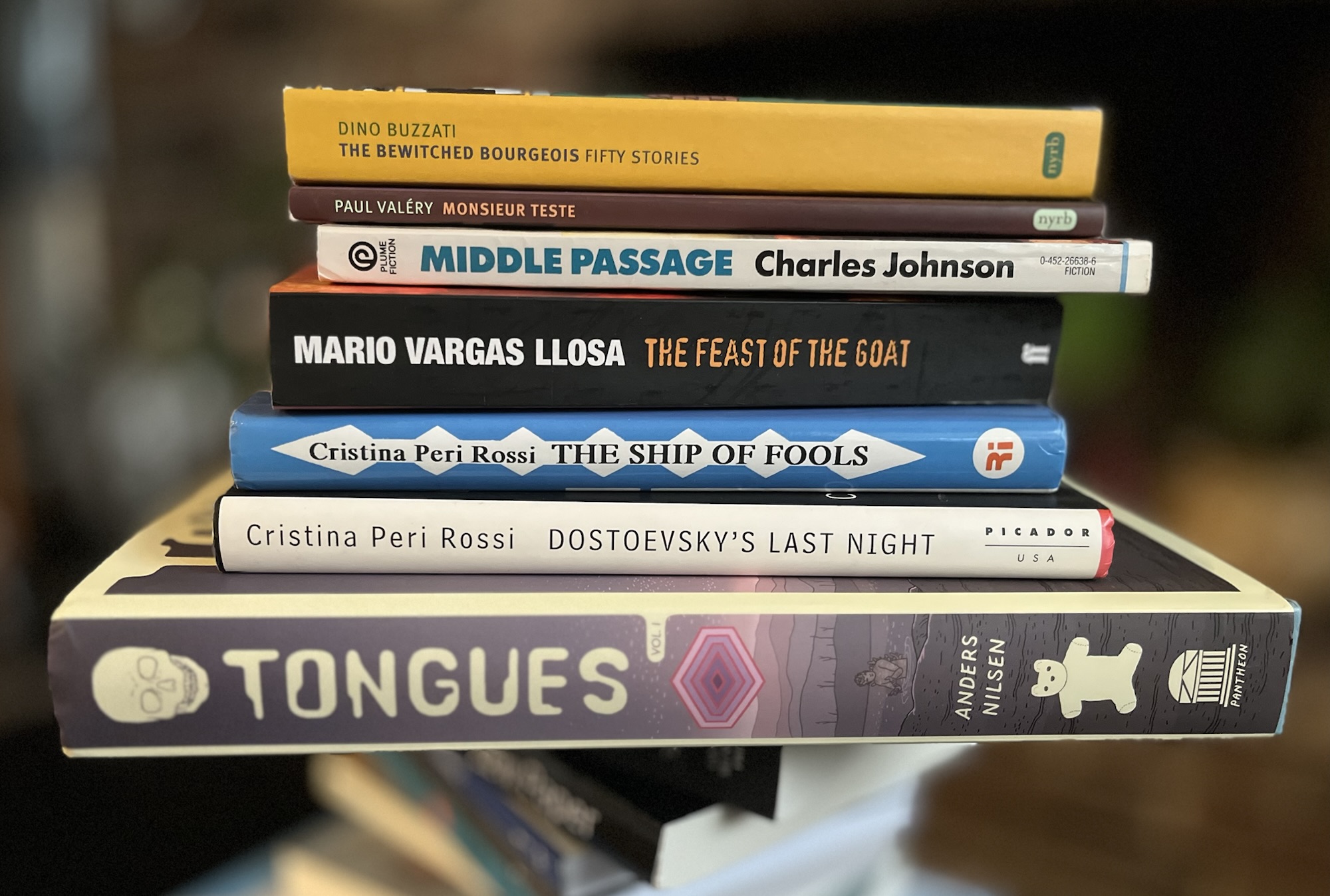 Harvey’s is, as far as I can tell, a Friends of the Library venture run by volunteers. I didn’t expect much, but the fiction section was surprisingly well populated. For around five bucks I picked up Charles Johnson’s Middle Passage, Mario Vargas Llosa’s The Feast of the Goat, and two by Cristina Peri Rossi — The Ship of Fools and Dostoevsky’s Last Night.
