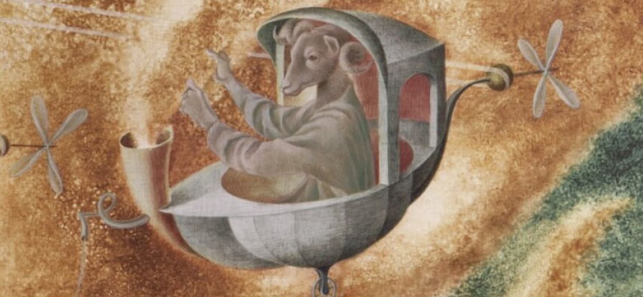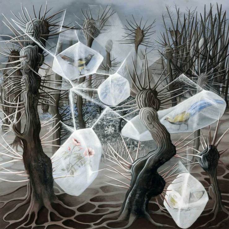 The next two lines refer to the well-known painting Mimesis / Mimetismo, in which she depicts a woman undergoing a metamorphosis – she’s taking on the characteristics of the chair she’s sitting in. (Side note: Varo’s catalogue raisonné translates the title of this painting as Mimesis, which isn’t wrong, but it makes me think more of the Erich Auerbach book and literary mimesis. I believe a better English translation would be “Mimicry,” as in insect mimicry, a phenomenon of particular interest to the surrealists. See Roger Caillois’s 1935 essay “Mimétisme et psychasthénie légendaire,” in the surrealist journal Minotaure).