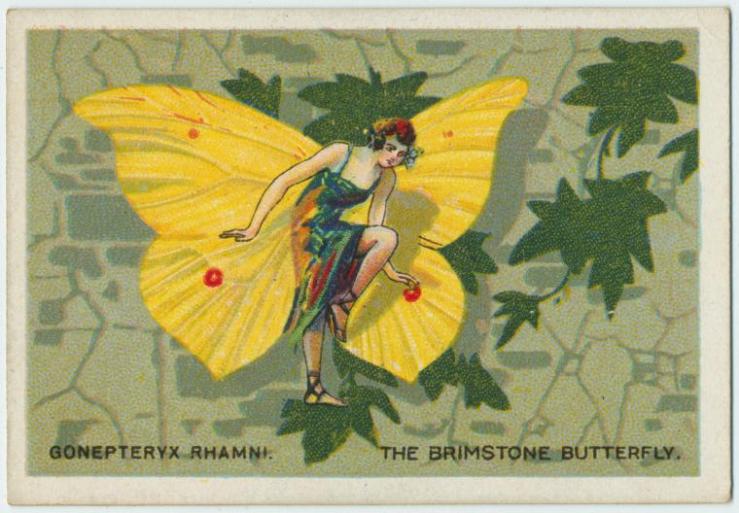 Three taxa of butterflies. The Comma (Polygonia c-album) is one of the anglewings; sulfur-yellow brimstones are in the genus Gonepteryx in the family Pieridae; painted ladies are in the genus Vanessa. The Comma is named for a so-shaped white mark on the underside of its hindwing; a similarly-marked North American congener is called the Question Mark (P. interrogationis).
