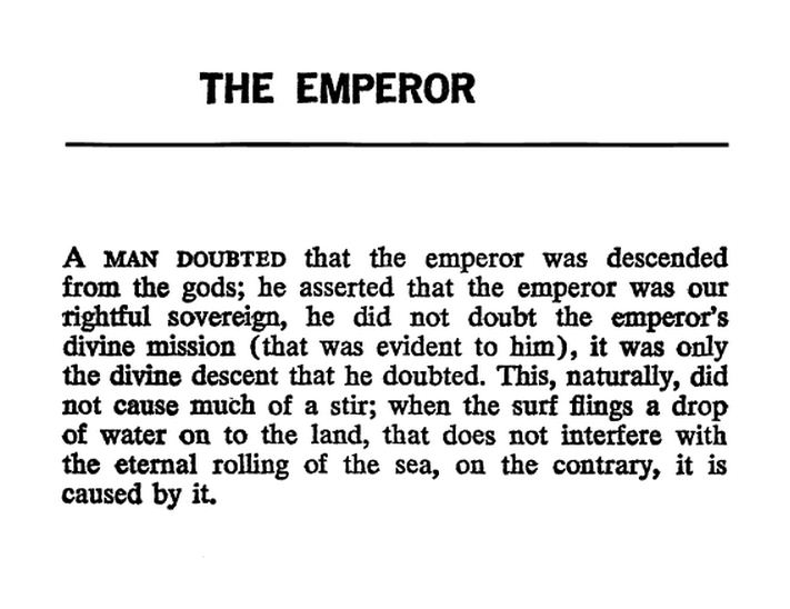 If some frail tubercular lady circus rider were to be driven in circles around and around the arena for months and months without interruption in front of a tireless public on a swaying horse by a merciless whip-wielding master of ceremonies, spinning on the horse, throwing kisses and swaying at the waist, and if this performance, amid the incessant roar of the orchestra and the ventilators, were to continue into the ever-expanding, gray future, accompanied by applause, which died down and then swelled up again, from hands which were really steam hammers, perhaps then a young visitor to the gallery might rush down the long stair case through all the levels, burst into the ring, and cry “Stop!” through the fanfares of the constantly adjusting orchestra.