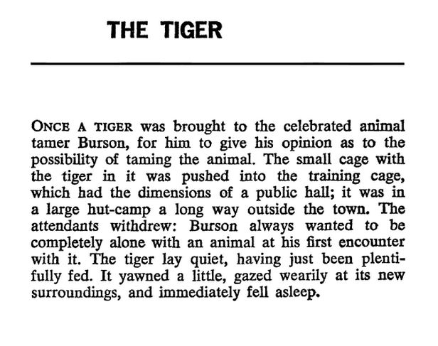 But since things are not like that—since a beautiful woman, in white and red, flies in through curtains which proud men in livery open in front of her, since the director, devotedly seeking her eyes, breathes in her direction, behaving like an animal, and, as a precaution, lifts her up on the dapple-gray horse, as if she were his grand daughter, the one he loved more than anything else, as she starts a dangerous journey, but he cannot decide to give the signal with his whip and finally, controlling himself, gives it a crack, runs right beside the horse with his mouth open, follows the rider’s leaps with a sharp gaze, hardly capable of comprehending her skill, tries to warn her by calling out in English, furiously castigating the grooms holding hoops, telling them to pay the most scrupulous attention, and begs the orchestra, with upraised arms, to be quiet before the great jump, finally lifts the small woman down from the trembling horse, kisses her on both cheeks, considers no public tribute adequate, while she herself, leaning on him, high on the tips of her toes, with dust swirling around her, arms outstretched and head thrown back, wants to share her luck with the entire circus—since this is how things are, the visitor to the gallery puts his face on the railing and, sinking into the final march as if into a difficult dream, weeps, without realizing it.
