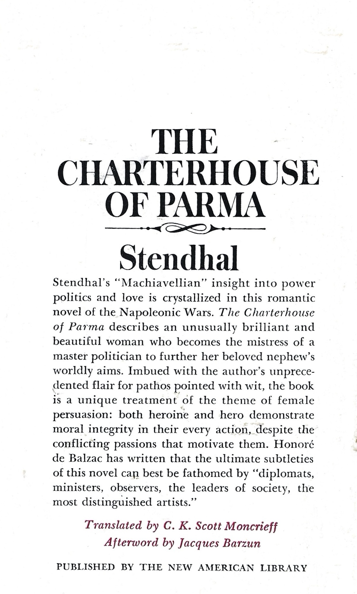The Charterhouse of Parma, 1839, Stendhal. Translation by C.K. Scott Moncrieff. Signet Classics (1962). No cover artist credited. 502 pages.