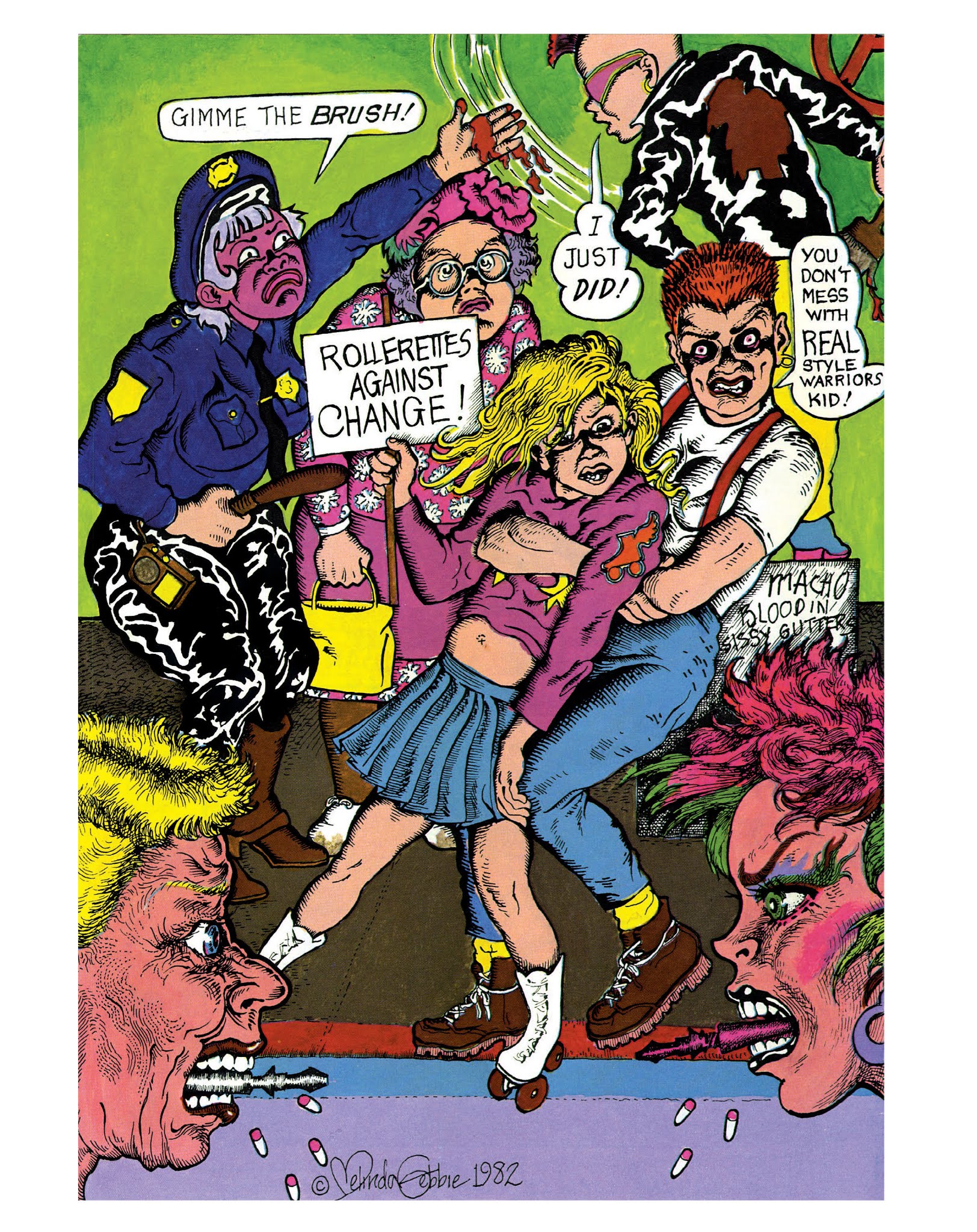 “Rollerettes Against Change!” by Melinda Gebbie. The piece is the back cover of Wimmin’s Comix #8, March 1983, Last Gasp. Reprinted in The Complete Wimmin’s Comix, 2016, Fantagraphics.